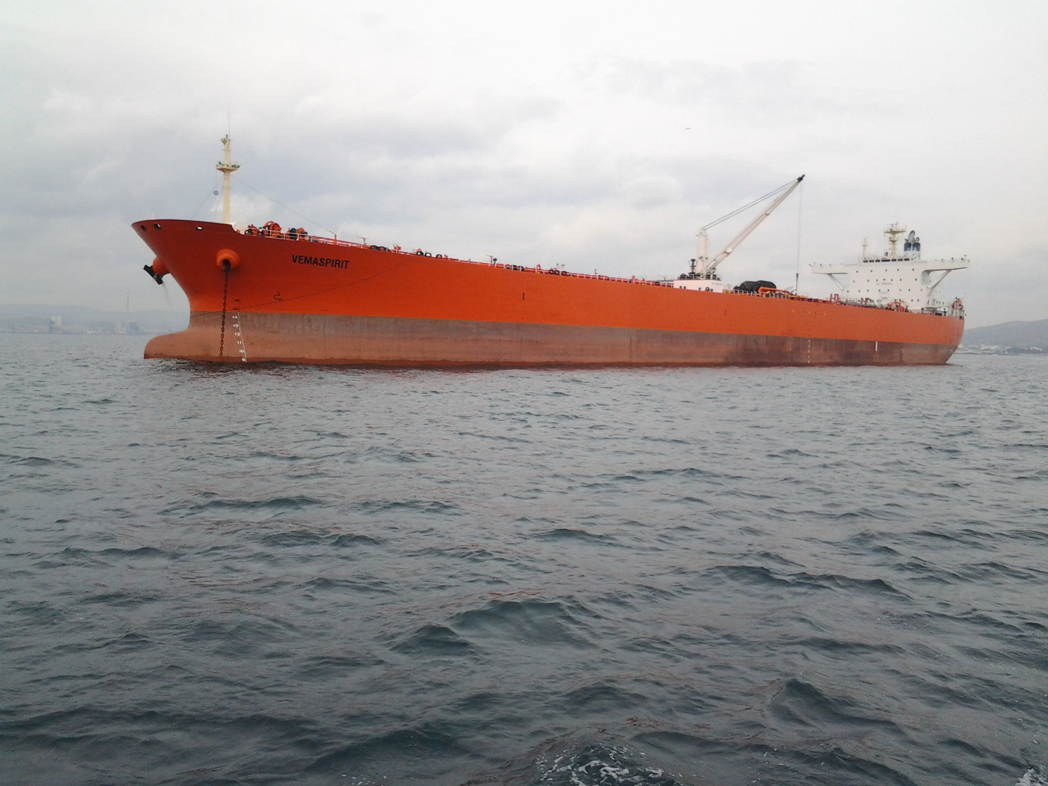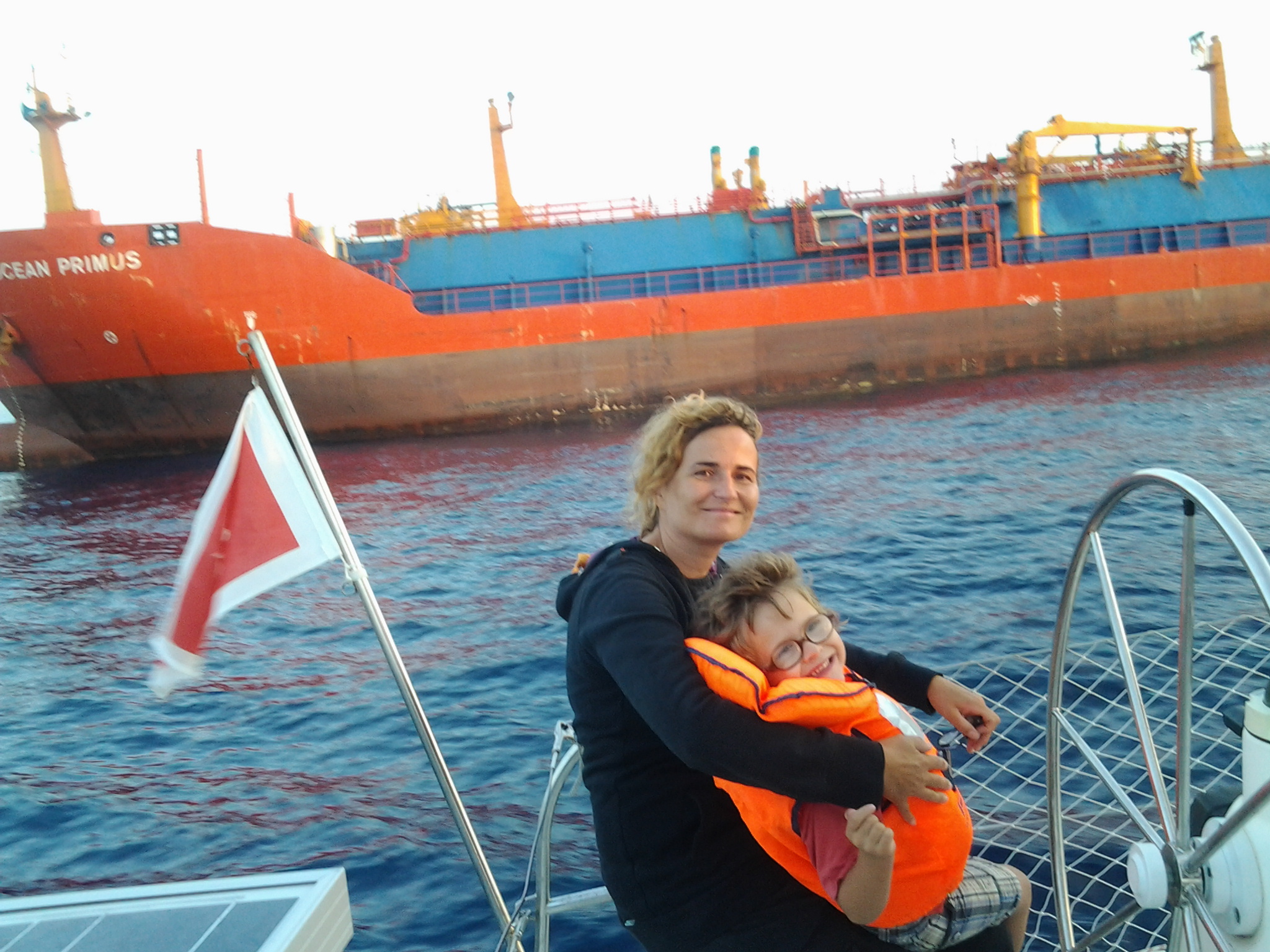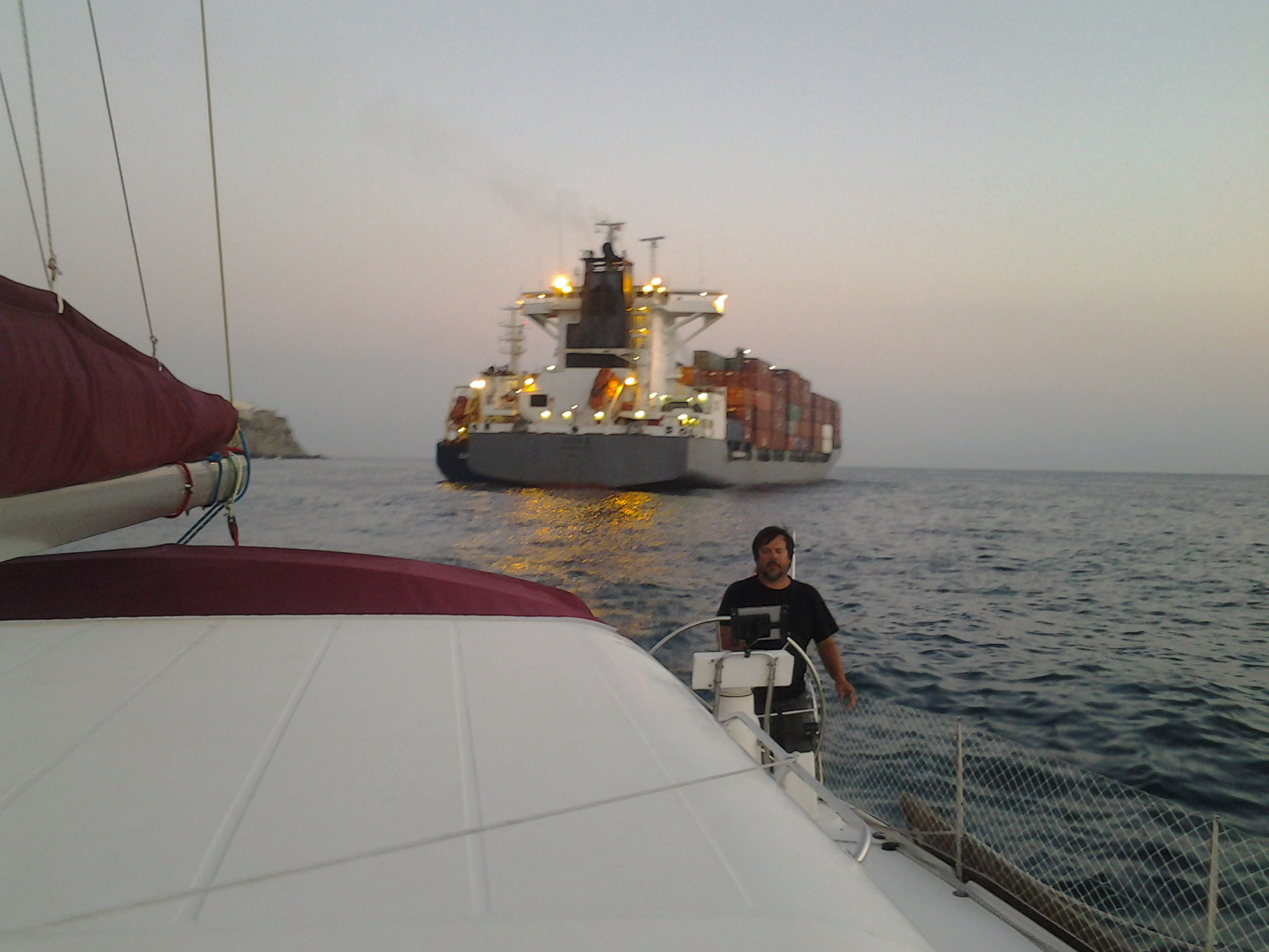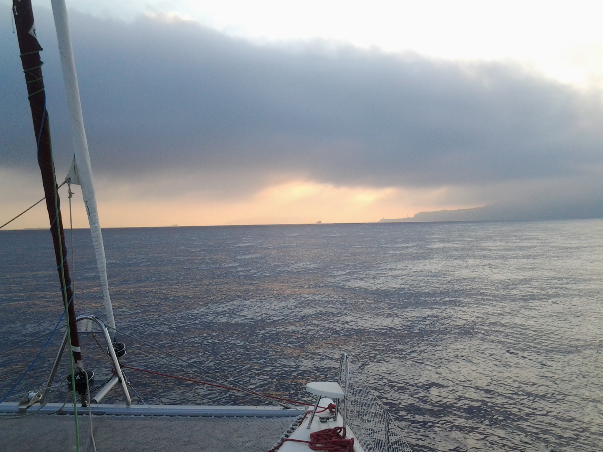 Etrange ! Nous passons le détroit de Gibraltar par temps calme ! L’eau est à 19°C mais pas de tempête, ni de grosses vagues. Rien avoir avec les forces 6/8 que nous prédisait le manuel. Par contre, pour le moment, le courant nous est assez favorable et accélère fortement la vitesse du bateau qui passe parfois de 5 à 8 nœuds rien que sous l’impulsion du courant.